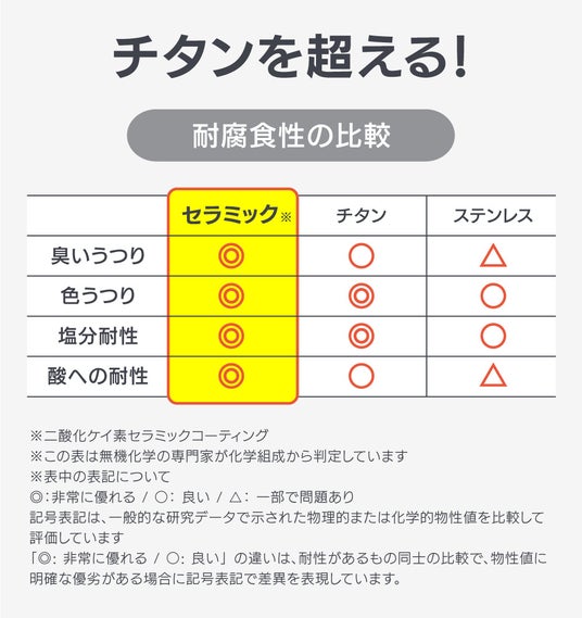 ●チタンを超える耐腐食性で金属臭、臭いうつり、色うつりナシ