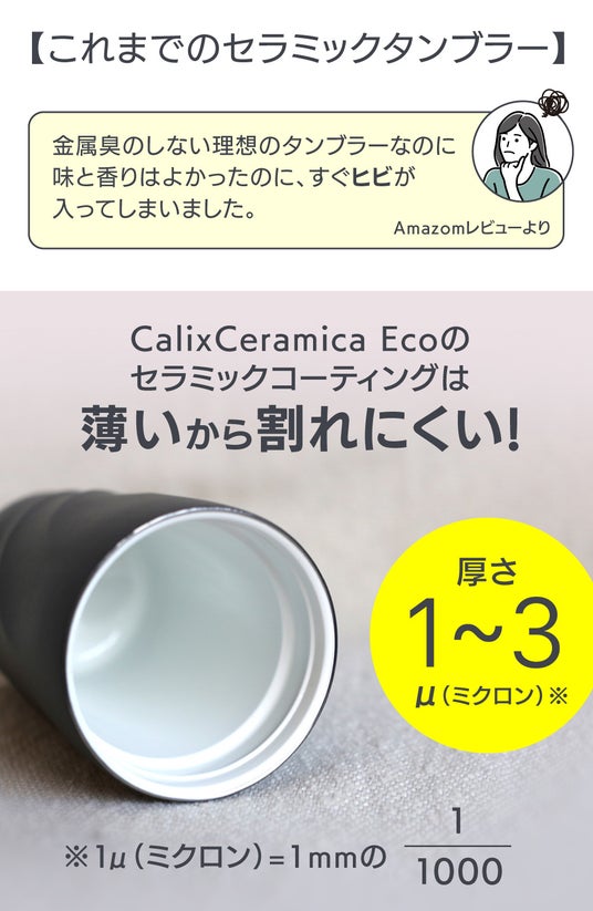 これまで、セラミックを使ったタンブラーは、すぐにヒビが入ってしまうという消費者の声が上がっていました。この課題に対し「Calix Ceramica Eco」は、コーティングが薄いほど柔軟になるという物理的性質を生かし、厚さ1~3μ(ミクロン)※ という薄さでコーティングを施し、割れにくさを実現しています。また、薄くなることで耐腐食性が劣化することはなく、安心して長くお使いいただけます。電子デバイス用のハイバリアセラミックの技術者もこのコーティングを絶賛しています。