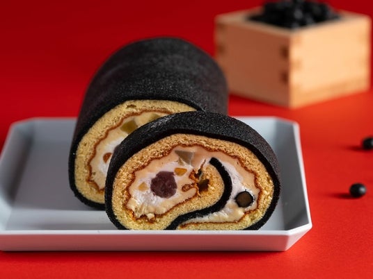 竹炭入りの求肥生地を海苔に見立てた恵方巻のようなロールケーキ。濃口醤油を加えてキャラメル風味に仕上げたカスタードクリーム、北海道産小豆のクリームと生クリームで、伊予柑ピール・黒豆・栗をたっぷり巻き込みました。※店頭販売:2/1~2/3