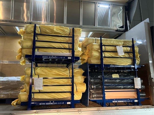 反物の特性に合わせて長さと高さの調整が可能な可変式輸送用ラックを開発、導入します。この革新的なラックにより、反物の規格の違いによる積載空間の無駄を解消し、積載効率を大幅に向上させることでトラック台数を削減します。