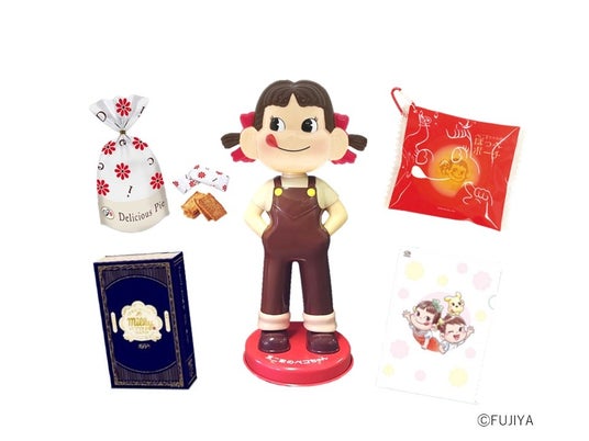 バレンタインの時期にぴったりなブラウンカラーのオーバーオールを着た「卓上ペコちゃん人形」が今回初登場! 西洋菓子舗 不二家の人気商品である「プレミアムミルキーバターサンド(5個入)」のほか、「デリシャスパイ(8包入)」や「ペコちゃんのほっぺポーチ」、「クリアファイル」を詰め合わせたお得なお楽しみ袋が数量限定で登場します。