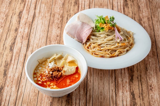 新感覚「担々つけ麺」もち麦配合の中太ちぢれ麺は風味豊かでモチモチの食感が特徴。