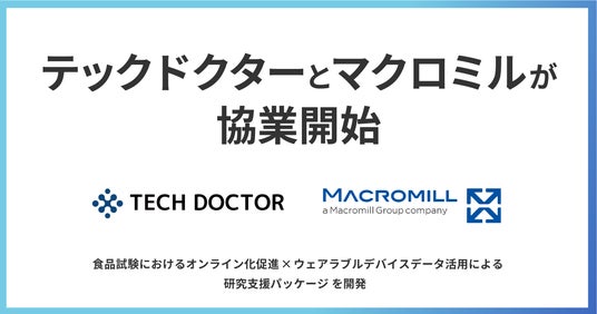 株式会社テックドクター(本社:東京都中央区、代表取締役:湊和修 以下、テックドクター)と株式会社マクロミル(本社:東京都港区、代表執行役社長 CEO:佐々木徹 以下、マクロミル)は、臨床試験におけるオンライン化促進とウェアラブルデバイスデータの利活用支援強化を目的とした協業を進めるべく、基本合意書を締結しましたのでお知らせします。今後、両社の知見を融合し、特に女性特有の悩みや睡眠などの不定愁訴領域を中心に企業の研究推進を支援します。