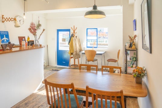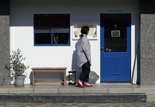 白い壁と扉や窓にブルーを利かせたファサードは、川沿いを歩くひとの目をひき、立ち寄りたくなるお店に。インテリアも白とブルーを基調に明るく温かみのある空間作りを心掛けました。