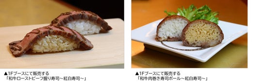 132年の時を超えた復刻商品『名誉金牌』が用いられた「和牛ローストビーフ握り寿司~紅白寿司~」や「和牛肉巻き寿司ボール~紅白寿司~」、SNSで話題になったロングセラー商品『すしのこ』が