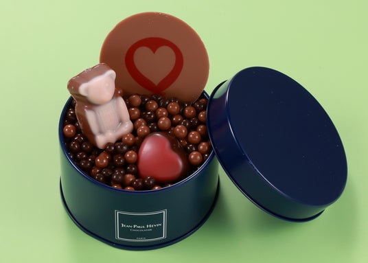 ハートのデザインを施したパレと、クマの形のショコラ、ハートのショコラとペルル クラッカントゥをブルーの缶に詰合せ。
