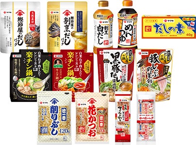 削り節商品は、国内製造かつお節を100%使用したロングセラー商品の「徳一番(R)花かつお70g」や、ヤマキ特許製法のかつお節を使用した「氷熟(R)マイルド削り 1.5g×12P」、削りたての風味と食感が特徴の「新鮮一番かつおパック 1.5g×8P」などを。だし商品は、万能タイプの液体調味料「割烹白だし500ml」やつゆカテゴリー濃縮中容量シェアNo.1(※)を獲得している「めんつゆ500ml」などを選定しました。また、この季節にぴったりな鍋つゆ商品2種や、今年2月に発売した具材を入れてレンジで8分間加熱するだけで1人前の鍋を作ることができる『楽チン鍋』シリーズも加えた計13点がセットになっています。