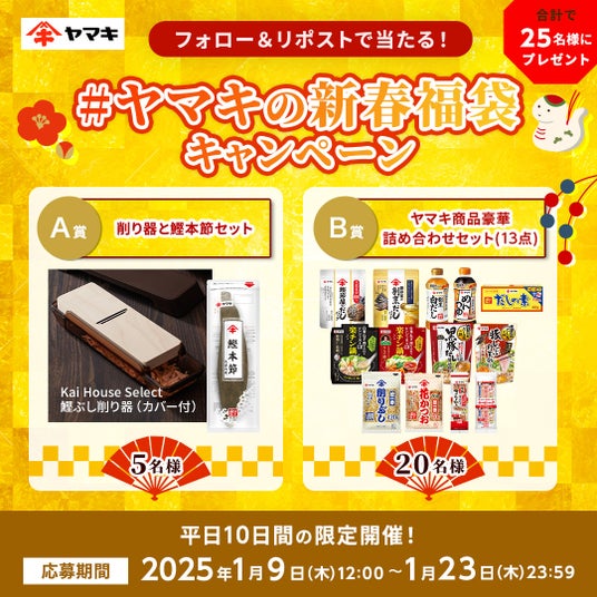 ヤマキ株式会社(本社:愛媛県伊予市 代表取締役社長:城戸善浩 以下ヤマキ)は、2025年1月9日(木)12:00より、X(旧:Twitter)アカウントにて「#ヤマキの新春福袋キャンペーン」を実施します。
