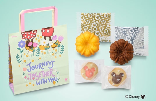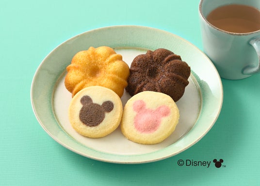 アソートの焼菓子は、お花の形に焼き上げた、しっとり食感のバター・ショコラ味のマドレーヌに、サクサク食感のミッキーアイコン柄クッキー2種。どちらも便利な個包装タイプで、フィルムにはミッキーとミニーアイコン柄がプリントされています。