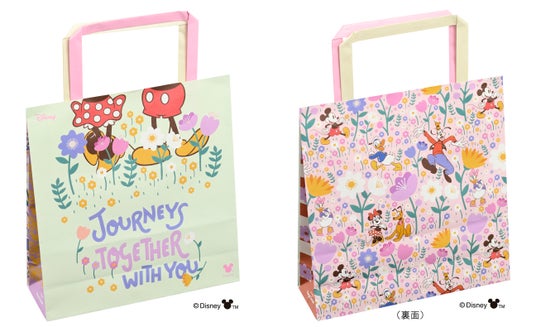 バッグの正面は、ミッキーマウスとミニーマウスがどんなお話や表情をしているのか想像がふくらむデザイン。裏面は、ミッキーマウスのお庭に仲間を招いて、お花見や散歩を楽しむ様子をデザインしました。自分用にはもちろん、ご家族やお友達などへのプチギフトにもぴったり♪