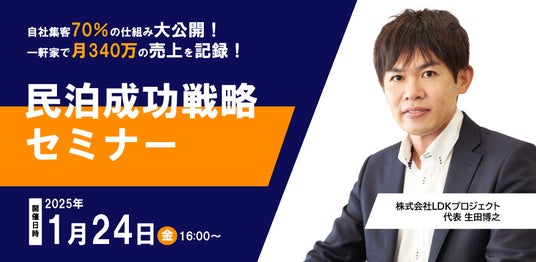 関西を中心に民泊/貸別荘施設を運営する株式会社LDKプロジェクト(所在地:大阪府中央区、代表:生田博之)は2025年1月24日(金)に大阪松屋町にある本社ビルにて初の自社セミナーを先着10名で行います。競争が激化する民泊市場で着実に業績を伸ばしている弊社が、過去の事例を元に民泊ビジネス参入のポイントをご紹介いたします。《※不動産会社、工務店様メインの募集となります》