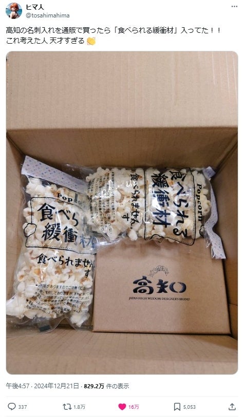 『高知の名刺入れを通販で買ったら「食べられる緩衝材」入ってた!!これ考えた人 天才すぎる 』この投稿が829万いいねを突破するなど大きな話題を生みました。