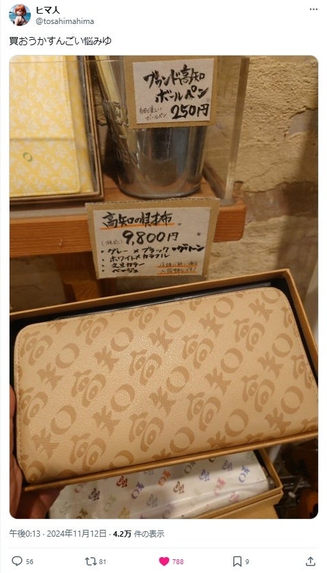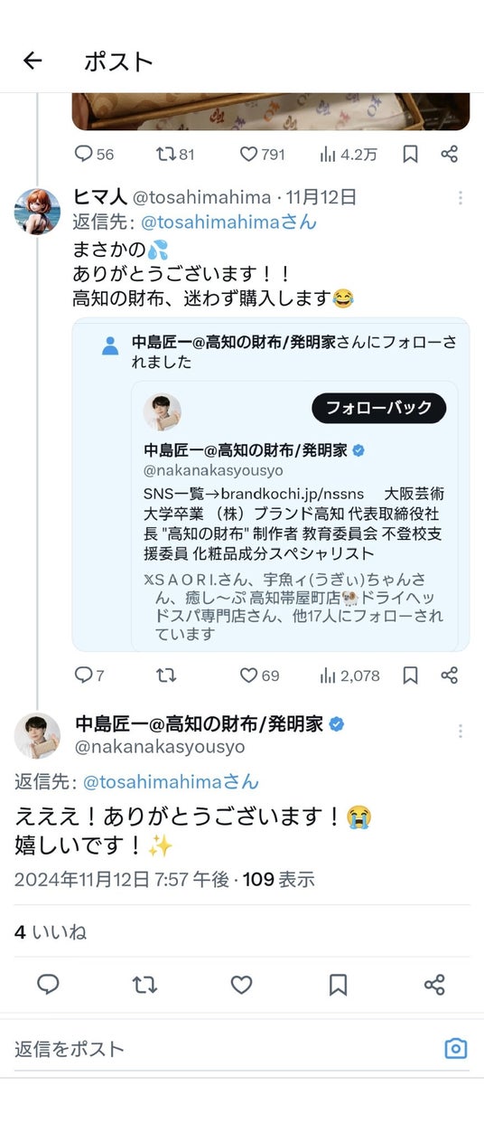 ヒマ人さんは2024年11月12日に「買おうかすごい悩みゆ」と迷いを投稿。その後、ブランド高知の中島 匠一代表がヒマ人さんをフォローしたところ