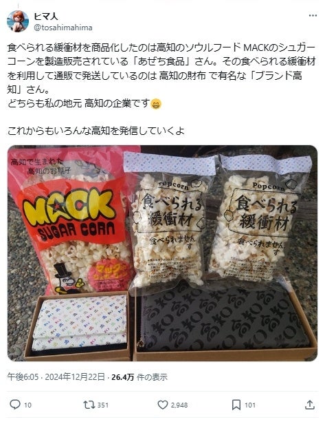 続きの投稿では、『食べられる緩衝材を商品化したのは高知のソウルフード MACKのシュガーコーンを製造販売されている「あぜち食品」さん。その食べられる緩衝材を利用して通販で発送しているのは「ブランド高知」さん。どちらも私の地元 高知の企業です これからもいろんな高知を発信していくよ』と語っています。