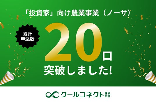 農業スタートアップのクールコネクト株式会社 (本社:群馬県伊勢崎市、代表取締役:神戸 翔太)は、「投資家」向け農業事業(ノーサ)の累計申込み数20口を突破したことをお知らせします。