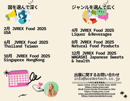 海外展開DXによる「日本の夜明け3.0」実現を目指し、日本食品メタバースグローバル展示会「JVREX Food」および日本食品BtoB越境ECサイト「JVREX Trade」を運営する株式会社BorderTech(千葉県流山市、代表取締役社長 岸本 誠)は、2025年度の年間イベントについてお知らせします。