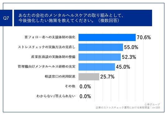 「Q7.あなたの会社のメンタルヘルスケアの取り組みとして、今後強化したい施策を教えてください。(複数回答)」(n=109)と質問したところ、「要フォロー者への支援体制の強化」が70.6%、「ストレスチェックの実施方法の見直し」が55.0%、「産業医面談の実施体制の整備」が52.3%という回答となりました。