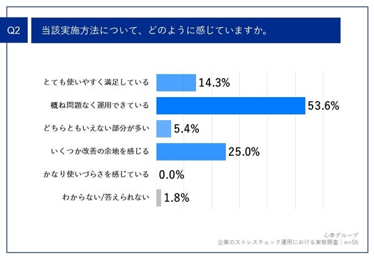 Q1で「外部の専用システムを契約して利用している」と回答した方に、「Q2.当該実施方法について、どのように感じていますか。」(n=56)と質問したところ、「概ね問題なく運用できている」が53.6%、「いくつか改善の余地を感じる」が25.0%、「とても使いやすく満足している」が14.3%という回答となりました。