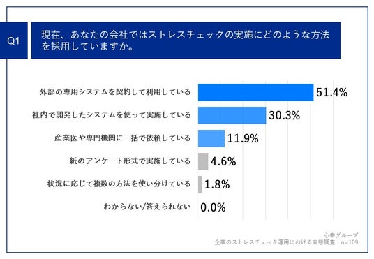 「Q1.現在、あなたの会社ではストレスチェックの実施にどのような方法を採用していますか。」(n=109)と質問したところ、「外部の専用システムを契約して利用している」が51.4%、「社内で開発したシステムを使って実施している」が30.3%、「産業医や専門機関に一括で依頼している」が11.9%という回答となりました。