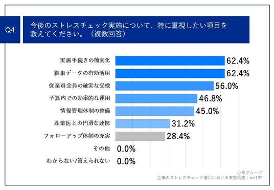 「Q4.今後のストレスチェック実施について、特に重視したい項目を教えてください。(複数回答)」(n=109)と質問したところ、「実施手続きの簡素化」が62.4%、「結果データの有効活用」が62.4%、「従業員全員の確実な受検」が56.0%という回答となりました。