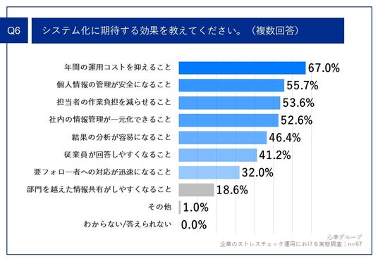 こうした課題を背景に、89.0%の企業が「ストレスチェックのシステム化を進めたい」と回答し、その期待効果として「年間の運用コストを抑えること」(67.0%)や「個人情報の管理が安全になること」(55.7%)を上位に挙げています。また、今後のストレスチェック実施については、「実施手続きの簡素化」「結果データの有効活用」(ともに62.4%)を重視する意向が見られました。