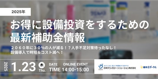 労働力不足が進む中、業務効率化が急務となっています。特に包装業界においては、最新の包装機械の導入が求められています。本セミナーでは、補助金を活用したお得な包装機導入方法を徹底解説します。株式会社補助金ポータル(本社:東京都渋谷区、代表取締役:代表取締役 福井 彰次)は、日本テクノロジーソリューション株式会社(本社:兵庫県神戸市、代表取締役社長 岡田 耕治)と共同で「2025年、お得に設備投資をする為の最新補助金情報!」をテーマにした無料オンラインセミナーを2025年1月23日(木)14時より開催いたします。ぜひご参加ください。