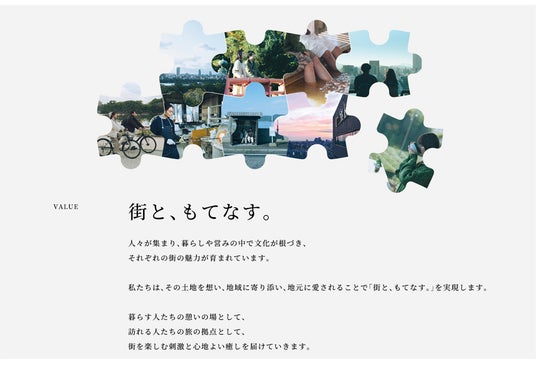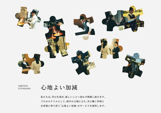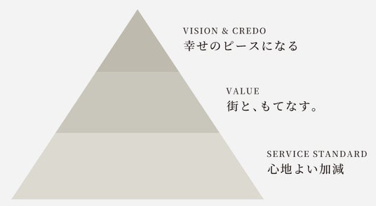 「幸せのピースになる」。私たちの目指すVisionであり、関わる全ての皆様に私たちの信条=Credoとしてお約束することです。その実現のために、私たちの提供するValueを「街と、もてなす。」としました。全国その土地土地に魅せられた私たちだからこそ提供できる、サービスや価値を届けてまいります。そして、その提供にあたってはService Standard「心地よい加減」を常に心に留め、プロのホテリエとしてお客様に寄り添います。日々、「心地よい加減」を積み重ね、「街と、もてなす。」ことで、皆様にとっての「幸せのピースになる」。それが私たちの願いです。