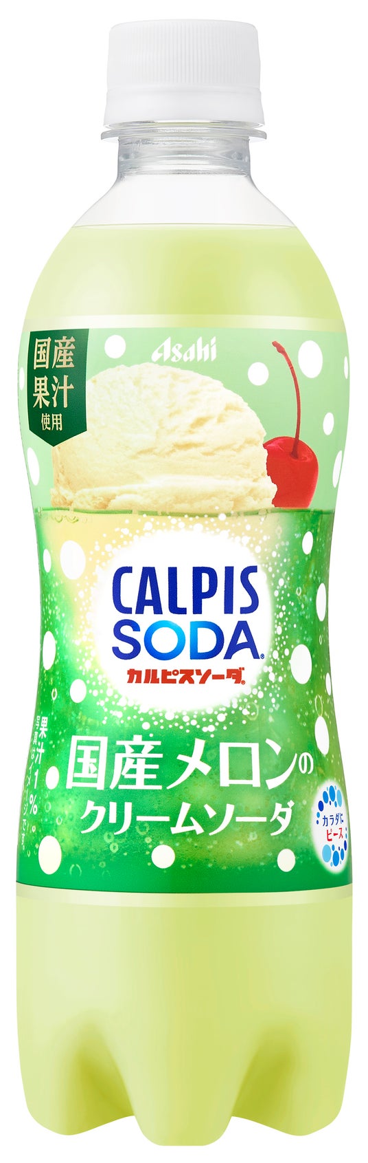 パッケージは昔懐かしい、親しみのあるクリームソーダの写真を背景に「カルピスソーダ」のロゴを中央に配置し、上部に“国産果汁使用”と記載することで商品特長を分かりやすく訴求しています。