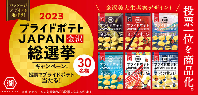 株式会社湖池屋(本社:板橋区/社長:佐藤章)は、「日本の誇り」である風土・文化やそれらが生み出す素材を「湖池屋プライドポテト」に込めて発信するプロジェクトとして2018年2月に始動した「湖池屋 JAPAN PRIDE プロジェクト」より、2023年9月に発売予定の「湖池屋プライドポテト JAPAN 金沢の甘えび」のパッケージデザインを一般投票により決定する『2023 プライドポテト JAPAN 金沢 総選挙』を実施します。