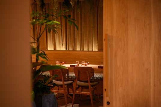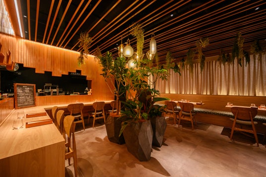 中央に鎮座するオーダーメイドの植栽がカウンター席とテーブル席の視線を遮るように配置されており、周囲の目を気にすることなく落ち着いて非日常の時間を過ごせるように設計しました。