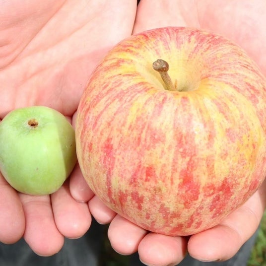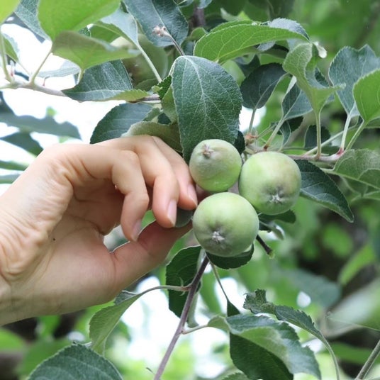 <アップサイクル>青森県弘前産摘果りんごを使用 りんごの本場・弘前の味にこだわりました。りんごはたくさん成ることで養分を奪うため、小玉になることを防ぐために夏の間に樹上にある果実全体の約9割を摘み取ります。年間の作業時間の75%は葉っぱや枝や実を捨てる作業です。この75%の時間を価値あるモノづくりに変えるため龍谷大学藤岡ゼミの協力のもと商品開発がスタートしました。今までは当たり前に棄てられてきたこの摘果りんごの爽やかな香りとちょっとした渋みに着目し、コク深く爽やかなりんご香るマドレーヌが完成しました。