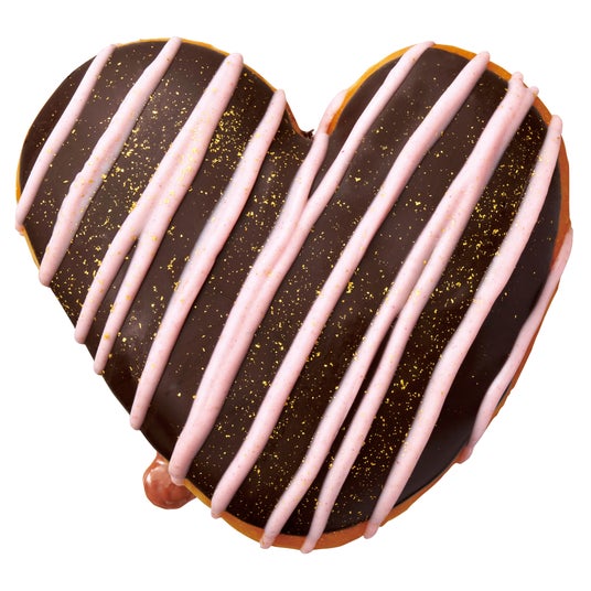 ハート型のふわふわ生地に、温めるとトロッととろけるフォンダンショコラクリームを詰め、ビターチョコでつつみました。ピンクのストライプはチョコと相性の良いストロベリーコーティング。仕上げにゴールドパウダーを散りばめてキラキラ華やかなバレンタインドーナツに。