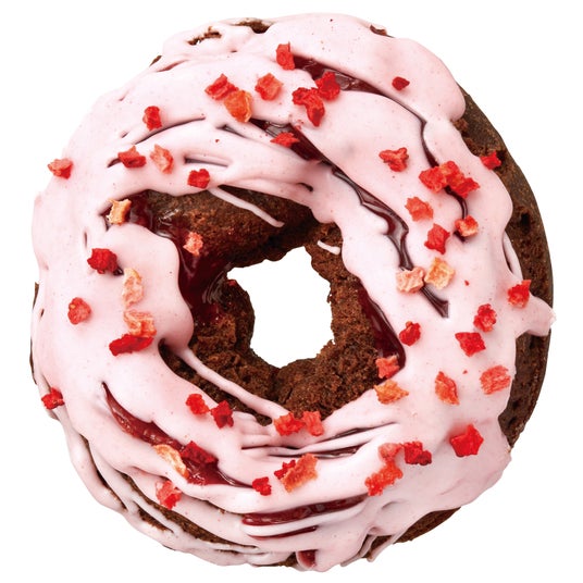 カカオの風味豊かなオールドファッション生地に、フルーティーなチェリーソースを合わせ、ストロベリーコーティングを重ねました。アクセントに甘酸っぱいフリーズドライ苺をトッピング。