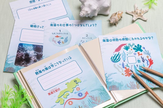 体験の最後は、本プログラム専用のワークシートに、体験を通して学んだ海藻や磯焼けの知識を項目に沿ってまとめていきます。また、体験中にスタッフが撮影した写真を貼りワークシートを完成させることで、家に帰ってからも学んだことを思い出すきっかけになります。