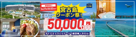 対象となるのは2025年1月15日(火)出発から2025年3月19日(水)帰着までのスカイマークの「みやこ下地空港」線に搭乗し、宮古島エリアのホテルに宿泊する旅行で、旅行代金に応じて最大50,000円OFFのクーポンがご利用いただけます。このキャンペーンにあわせてツアー代金も特別価格を設定。