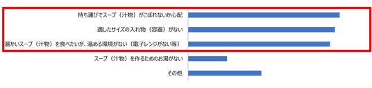 スープを食べられていない理由は「持ち運びでスープがこぼれないか不安/適した容器がない/温める環境(電子レンジ)がない」
