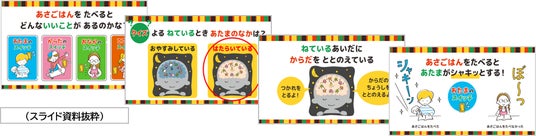 ・授業内容 : 「朝ごはんの大切さ」と「朝に適切な食事」の2つをメインテーマとし、学級活動や生活指導などに幅広くご活用いただけるスライド資料・冊子類をご提供。これらをもとに各校の教職員の指導方法に沿って授業を実施(1コマ45分)。