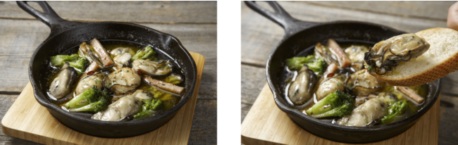今回、牡蠣好き必食のCOLDオイスター(生牡蠣)はもちろん、濃厚な旨味の牡蠣とコクのあるクリームスープが相性抜群のスープパスタが初登場。さらにグランドメニューから、大粒の牡蠣とガーリックの風味が食欲を刺激するアヒージョがラインナップ。