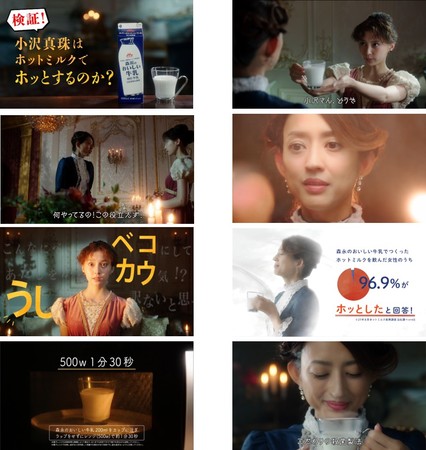 豪華な衣装に身を包んだ小沢さんは、後輩女優の度重なる失敗に怒りが収まらない様子。「も~ぅ!何やってるの!この役立たず!」「こんなにベッコベコにして、あたしをからカウ気!?」「もうし訳ないと思っているの!?」…ハイテンションで繰り出される怒涛のセリフからヒントを感じた後輩女優は、慌てて部屋を後にします。戸惑う小沢さんに、手際よくレンジで温めた「森永のおいしい牛乳」を差し出す後輩女優。「何よ、コレ」と訝しがる小沢さんでしたが、ホットミルクを一口飲んだ途端、その表情はみるみるうちに変化します。ふーっと息を吹きかけ、もう一口ホットミルクを飲んだ小沢さんは、「ホッと」した、とても幸せそうな表情をみせます。