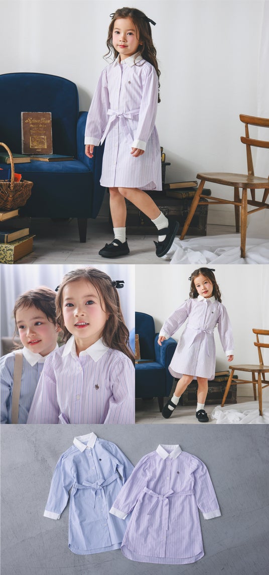 ストライプシャツとお揃いデザインのシャツワンピースは、ウエストリボン付きですっきりしたシルエットに。ワンピース1枚で春のコーデがきれいに決まります♪