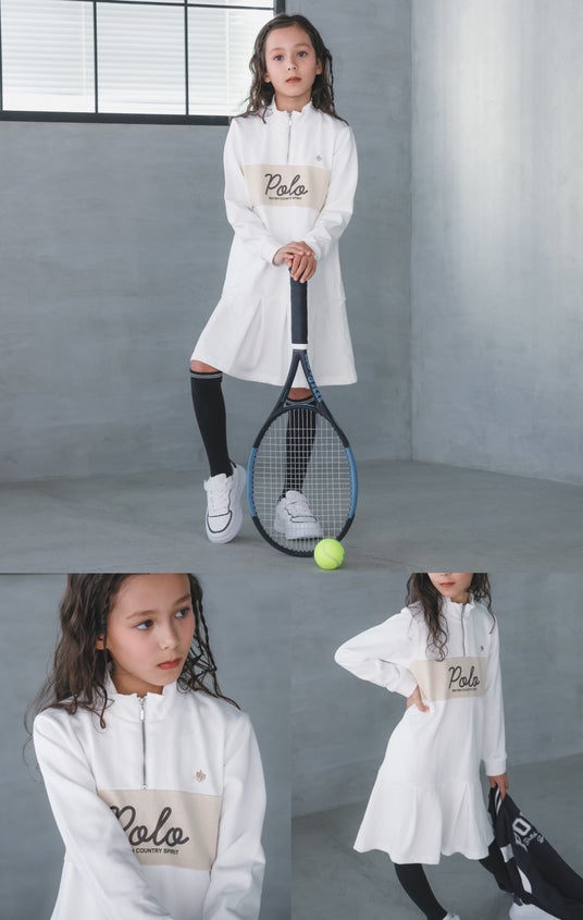 胸元のプレイヤーの刺繍と、切り替え部分にプリントされたロゴがクラシカルな印象を与えるワンピース。ふんわり広がった裾はかわいらしい上品さも♪