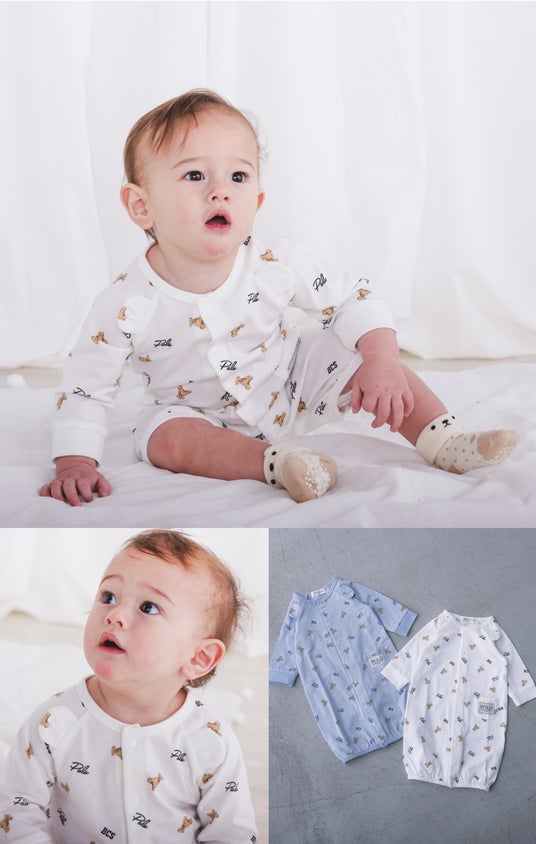 クマ耳&クマの総柄がとってもキュートなツーウェイオールは、男女性別問わず着用できるユニセックスタイプ。裾をホックで閉じられるので、シーンや好みに合わせてワンピースのようにもロンパースのようにも着られます。