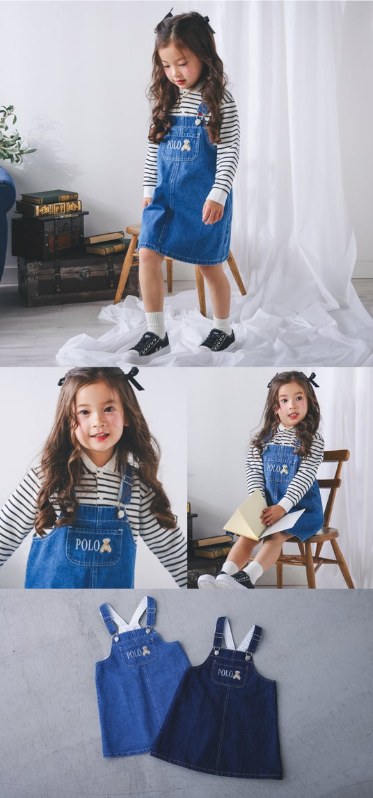 デニム素材が春らしいサロペットスカートは、ポケットにロゴ&可愛いクマの刺繍がアクセントに。