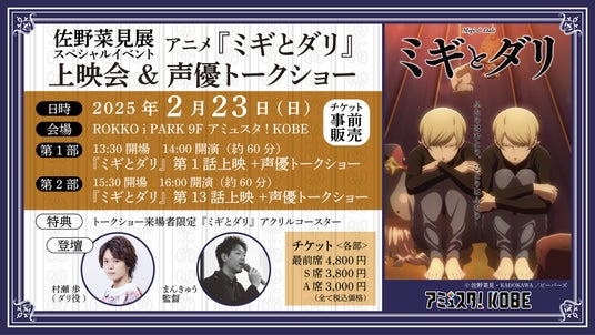 アニメ『ミギとダリ』のダリ役・村瀬歩さん×まんきゅう監督によるスペシャルトークショーの開催が実現いたしました。トークショーイベントは二部構成で、それぞれ第1部ではアニメ『ミギとダリ』の1話、第2部では13話をシアターで上映し、お二人のここでしか聞けないトークを展開していただきます。チケット全席事前販売となっており、1月24日(金)10:00~二次販売の受付開始です。