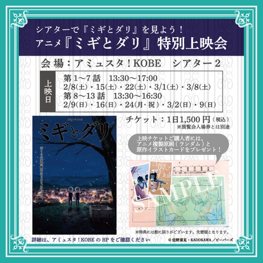 アミュスタ!KOBEのシアターでアニメ『ミギとダリ』全話を上映する特別上映会も開催決定!チケットご購入者の方には、 アニメ複製原画(ランダム)と原作イラストカードのプレゼントもございます。
