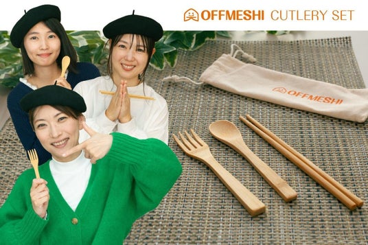 「オフめしカトラリーセット」には、竹素材で作られた箸、フォーク、スプーンが含まれ、オフめしのロゴ入り専用袋も付属しています。このセットは、持ち運びがしやすく、繰り返し使用可能なため、使い捨てカトラリーの代替品として最適です。