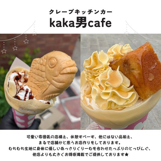 【kaka男cafe】可愛い雰囲気の店構え、休憩すぺーす、他にはない品揃え、まるで店舗かと思うお店作りをしております。むちむち生地に身体に優しいあっさりくりーむを合わせたっぷりのとっぴんぐ、他店よりも大きくお得感満載でご提供しております。