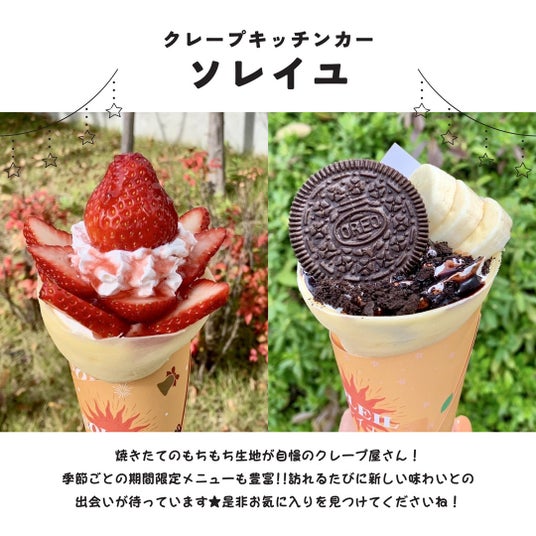 【Soleil (ソレイユ)】焼き立てのもちもち生地が自慢のクレープ屋さん!季節ごとの期間限定メニューも豊富。訪れるたびに新しい味わいとの出会いが待っています。ぜひお気に入りを見つけてくださいね!