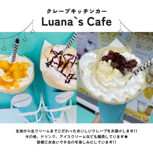 【Luana`s Cafe】生地から生クリームまでこだわったおいしいクレープをお届けします。その他、ドリンク・アイスクリームなども販売しています。みなさまにお会いできるのを楽しみにしています!