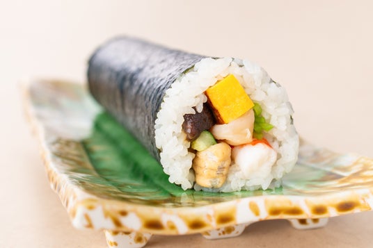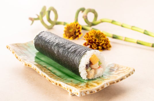 7種の具材に真珠貝(アコヤ貝)の貝柱を加え巻き上げた恵方巻